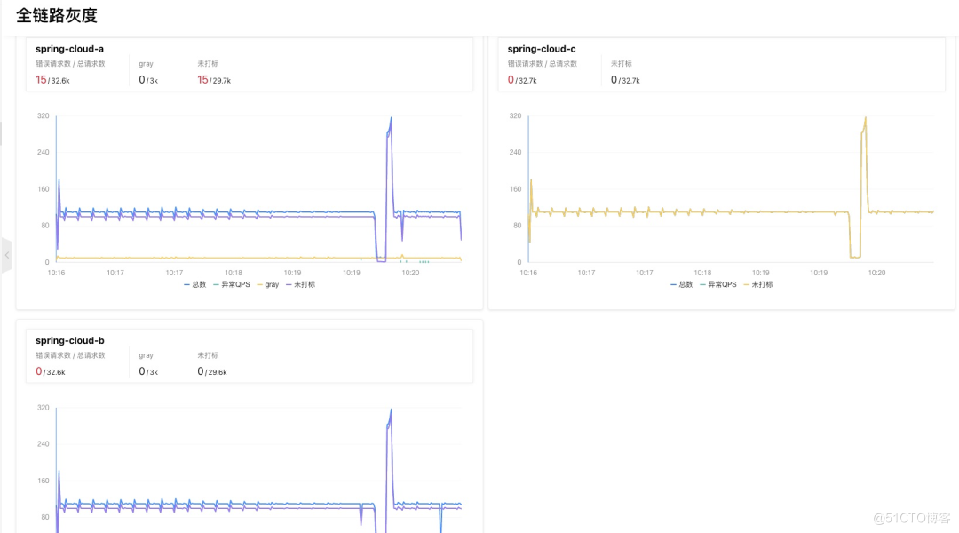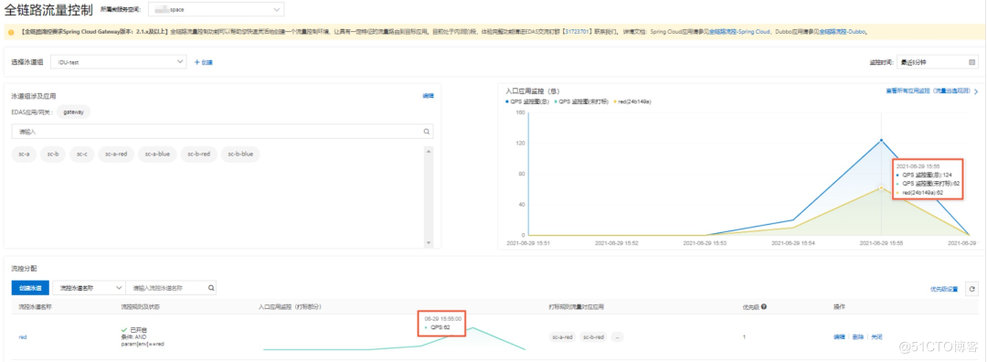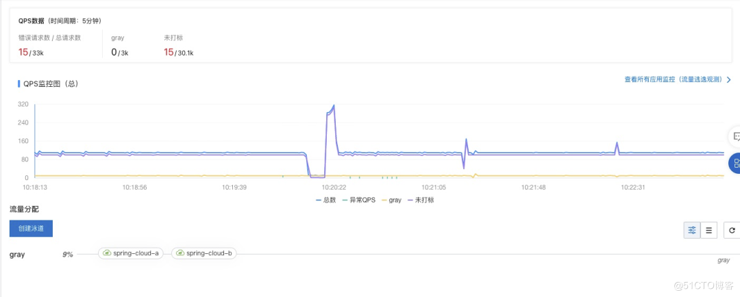 配置泳道成功后,可以在全链路流量控制界面选择目标泳道组进行流量观测,包括入口应用总的监控图、未打标部分监控图和打标部分监控图,及泳道组内所有应用的监控图。