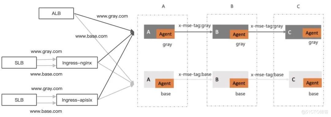 基于全链路灰度能力搭配合适的入口路由网关即可实现全链路流量灰度,如上述使用 Ingress-Nginx、Ingress-APISIX、ALB、MSE 云原生网关均可以作为流量入口。