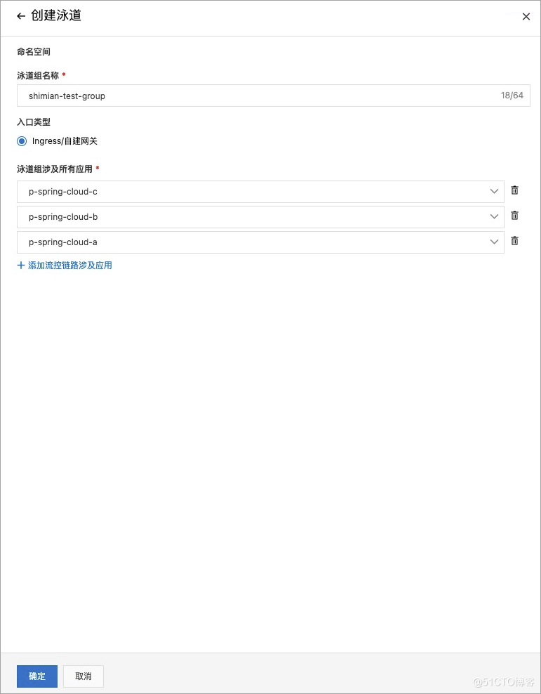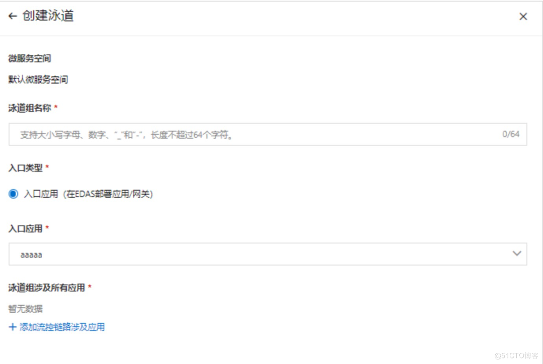 在创建泳道时需要选择入口类型,目前仅支持部署在 EDAS 中的入口应用作为泳道入口应用,需要将泳道中涉及的基线版本和灰度版本添加到泳道组涉及应用中。