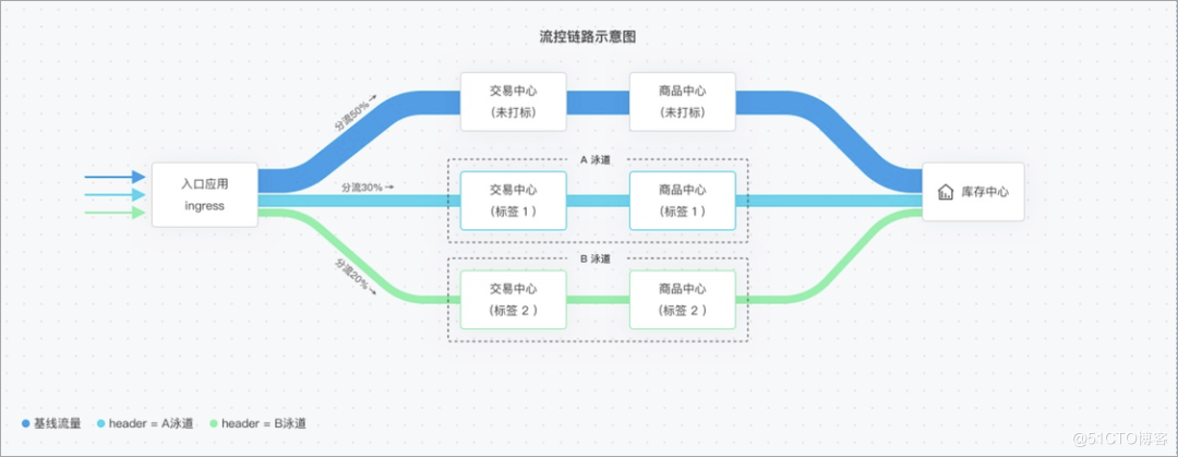 从上图中可以看到,我们分别创建了泳道 A 与泳道 B,里面涉及了交易中心、商品中心两个应用,分别是标签标签 2,其中 A 泳道分流了线上 30%的流量,B 泳道分流了线上 20%的流量,基线环境(即未打标的环境)分流了线上 50%的流量。