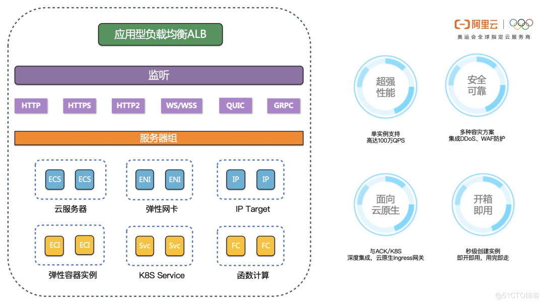 高级的协议: 支持 ALB 支持应用传输协议 QUIC,在实时音视频、互动直播和游戏等移动互联网应用场景中,访问速度更快,传输链路更安全可靠。ALB 同时支持 gRPC 框架,可实现海量微服务间的高效 API 通信。
