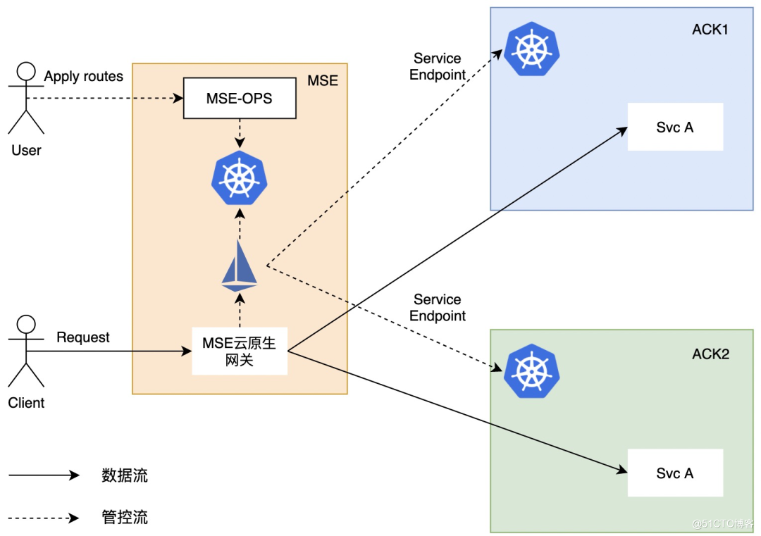 上图是 MSE 云原生网关在多集群模式下对业务应用进行流量管理的应用场景。MSE 云原生网关与阿里云容器服务 ACK 深度集成,可以做到自动发现服务以及对应的端点信息并动态秒级生效。用户只需简单在 MSE 管控平台关联对应的 Kubernetes ACK 集群,通过在路由管理模块中配置路由来对外暴露 ACK 中服务即可,同时可以按集群维度进行流量分流以及故障转移。此外,用户可以为业务路由实施额外的策略,如常见的限流、跨域或者重写。