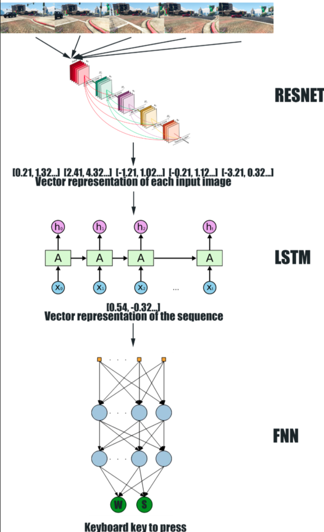 该项目的主要目的是实现一种可以在侠盗猎车手 5(GTAV,Grand Theft Auto V)中行驶的模型,实际可以适应于玩任何现有的视频游戏。该模型并不是按照交通法规进行驾驶,而是模仿人类在此游戏中的驾驶方式:全速行驶、避开其它汽车/人类/路灯行驶。