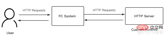 函数计算启动 Custom Runtime 执行环境时,会默认调用 bootstrap 文件(或者您创建函数的时设置的 Args 参数)启动您自定义的 HTTP Server,然后这个 HTTP Server 接管了函数计算系统的所有请求,即您所有的函数调用请求。