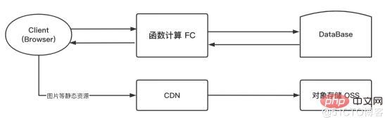当然, 从原始的传统的 php web 应用完全迁移到 Serverless 形态的函数计算平台,某些场景可能需要考虑数据持久化问题,因为函数计算是无状态的,数据持久化保存可以借助 NAS、Redis 等服务完成,以 NAS 为例,流程图如下:
