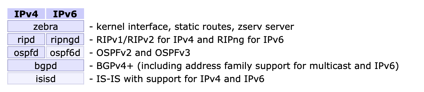 Quagga 架构由核心守护进程和 zebra 组成,后者作为底层 Unix 内核的抽象层,并通过 Unix 或者 TCP 向 Quagga 客户端提供 Zserv API。正是这些 Zserv 客户端实现了路由协议,并将路由的更新发送给 zebra 守护进程。当前 Zserv 的实现是: