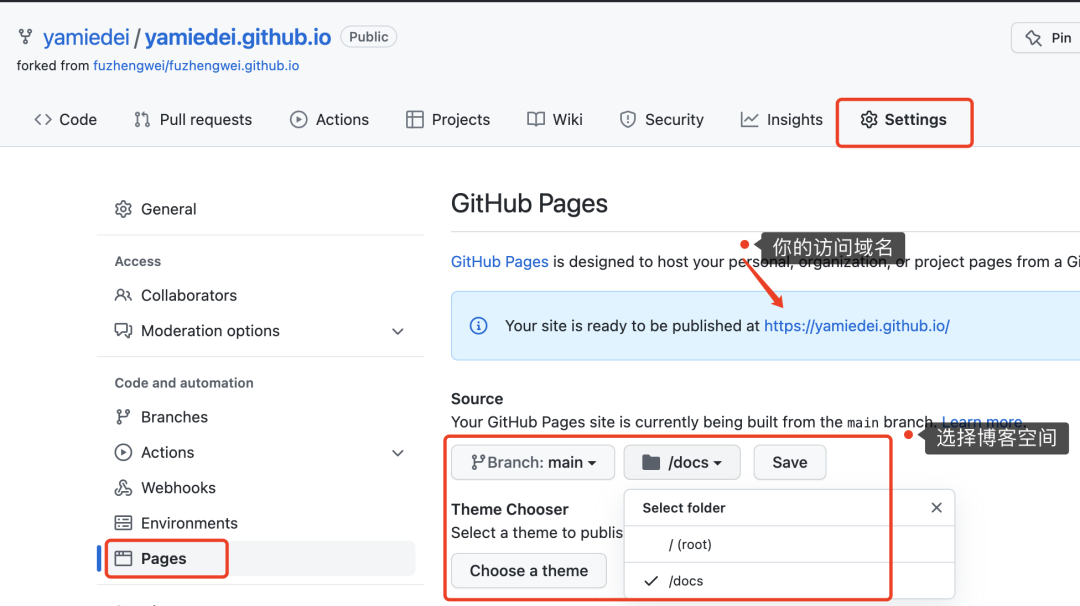 按照上图修改博客资源空间到 docs文件夹下,这个步骤是选择博客空间地址,记得不要配置错了。