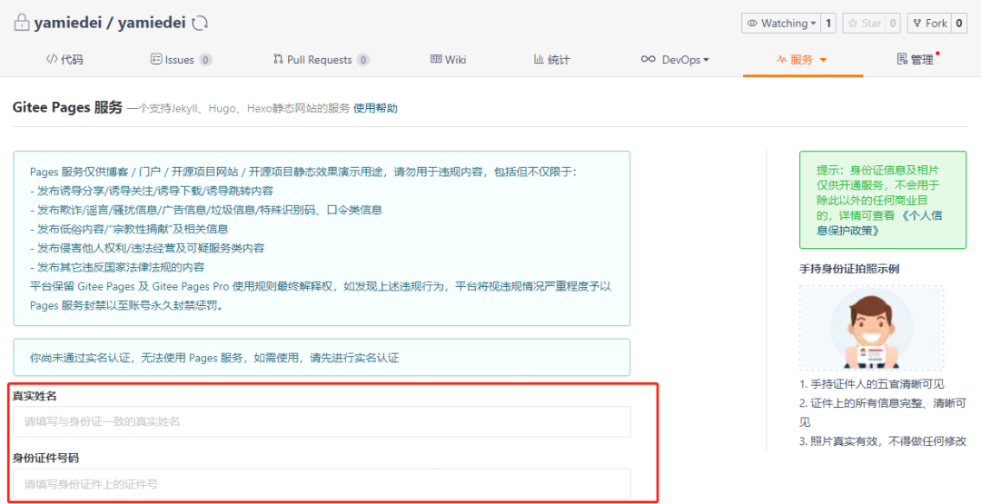 不过由于大家基本都是初次使用 Gitee Pages 它会要求你上传认证信息,一天内审核完成。