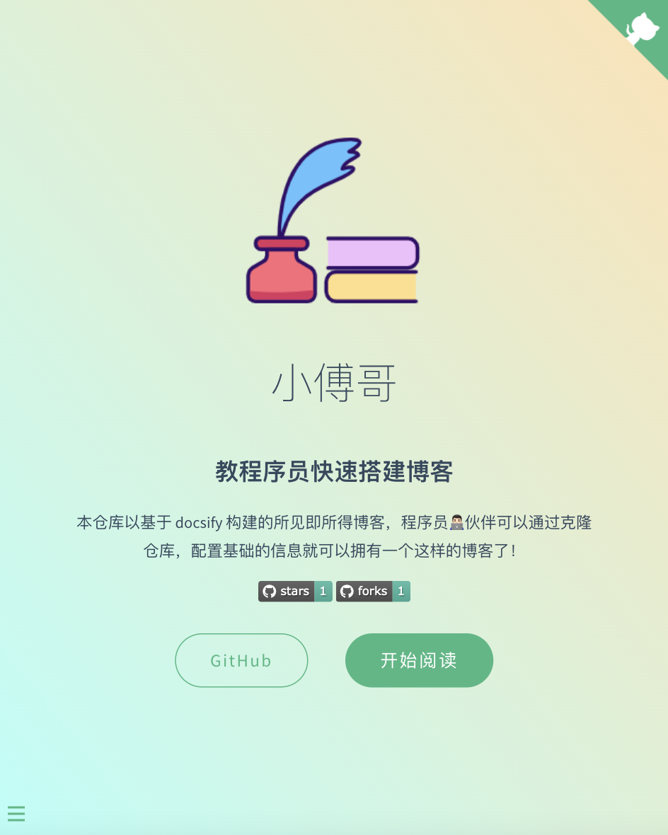 说明:这是一个 docsify 的博客仓库地址,一些必要的简单配置信息小傅哥已经帮你处理好了,直接使用即可。