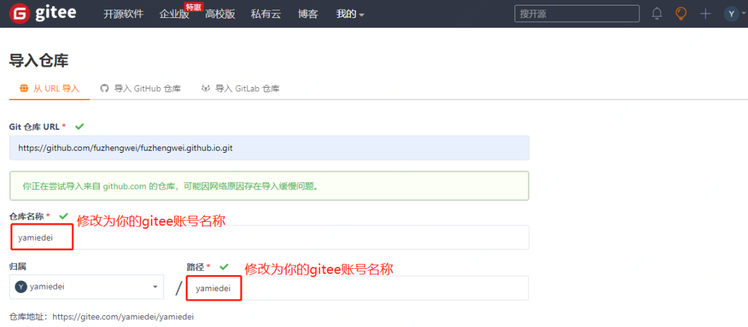 修改 仓库名称、路径,为你的 gitee 账号名称,我这里的名称为yamiedei,你复制自己的就可以了。