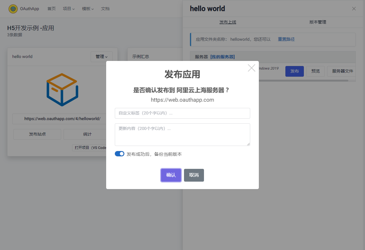 3,【新增功能】发布应用添加了:标签、描述、发布成功自动备份的设置