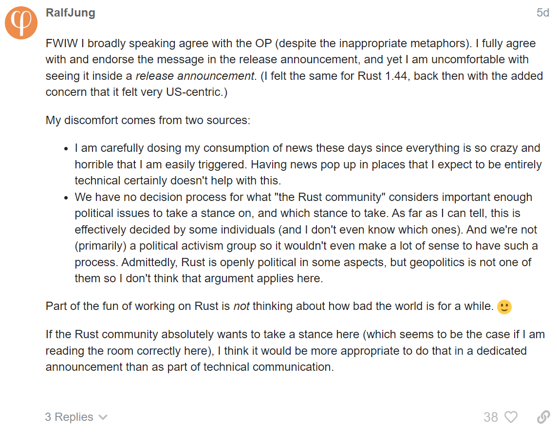 RalfJung 同时还提出了一个质疑:到底是哪些人在代表 Rust 社区进行这种关于政治立场/站队的决策?