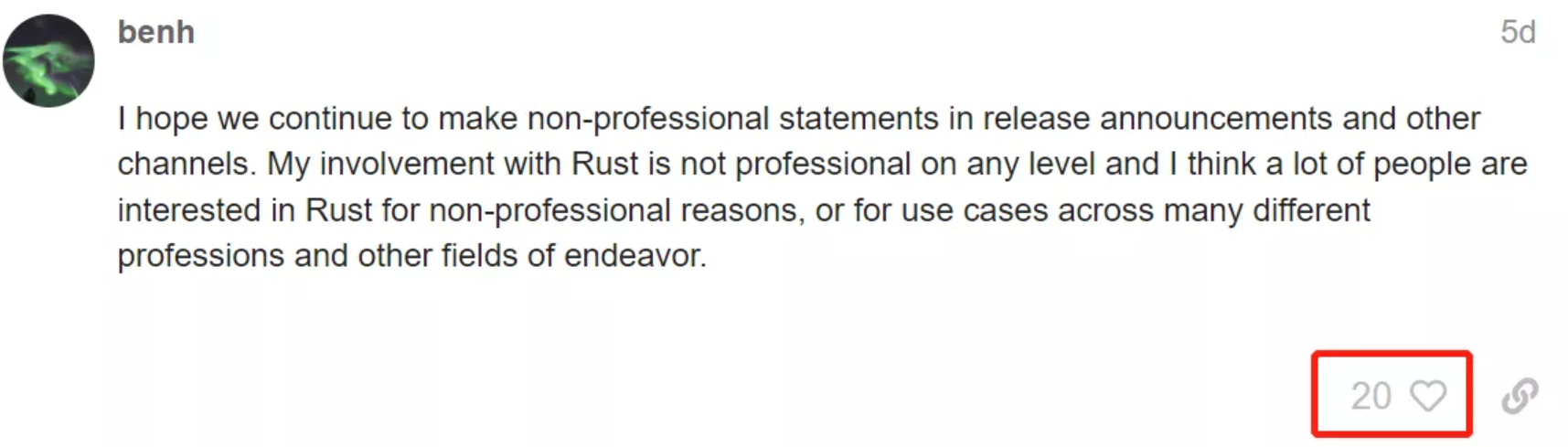 社区成员 benh 表示:我并不关心技术,对 Rust 也做不了啥贡献,关注 Rust 社区正是为了它的政治立场,建议 Rust 加大力度。(还挺多人点赞的...)