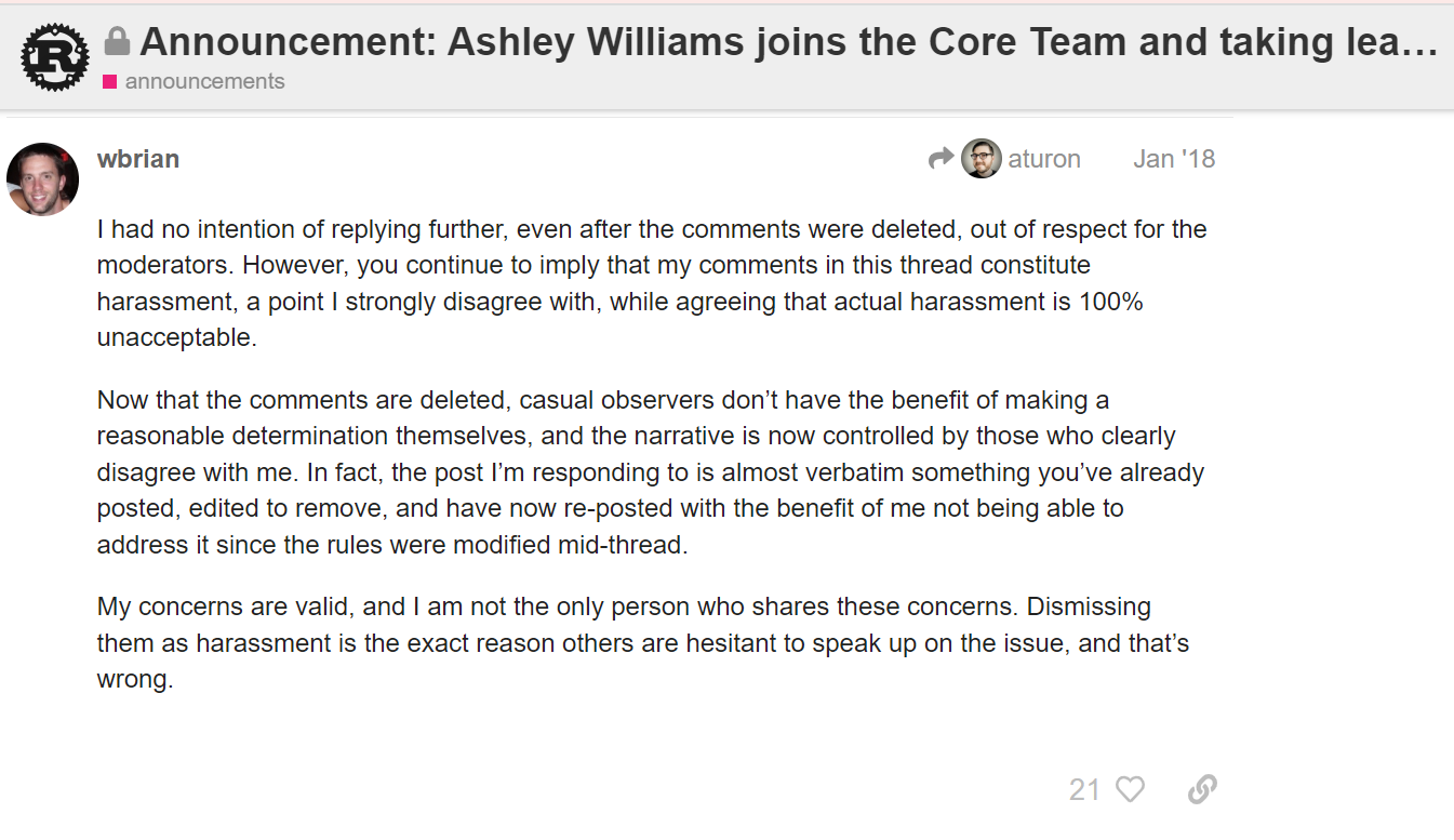 我(对 Ashley Williams)的担忧是有道理的,而且我不是唯一一个有这些担忧的人。 版主将我(对 Ashley Williams)的评价视为骚扰,是其他人不愿就这个问题(指 Ashley Williams 加入 Rust)发表意见的确切原因,这是错误的。