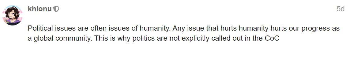 社区管理员 khionu 认为政治问题同时也是人性问题,开源社区有人情味才能更好地进步。