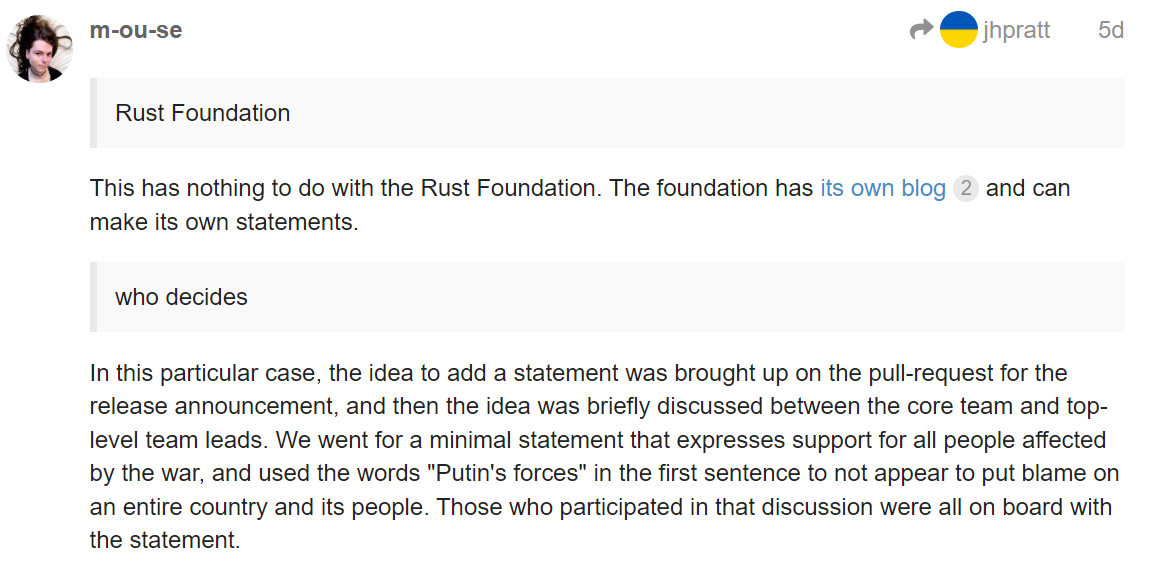 随着讨论的进行,陆续有一些成员赞同 “HuaguoShan”的观点。成员 RalfJung 表示,尽管自己同意 Rust 关于乌克兰的声明,但在版本发布公告中看到这个声明会感到很不舒服。他认为 Rust 在专门的公告中声明对乌克兰的支持会更合适。