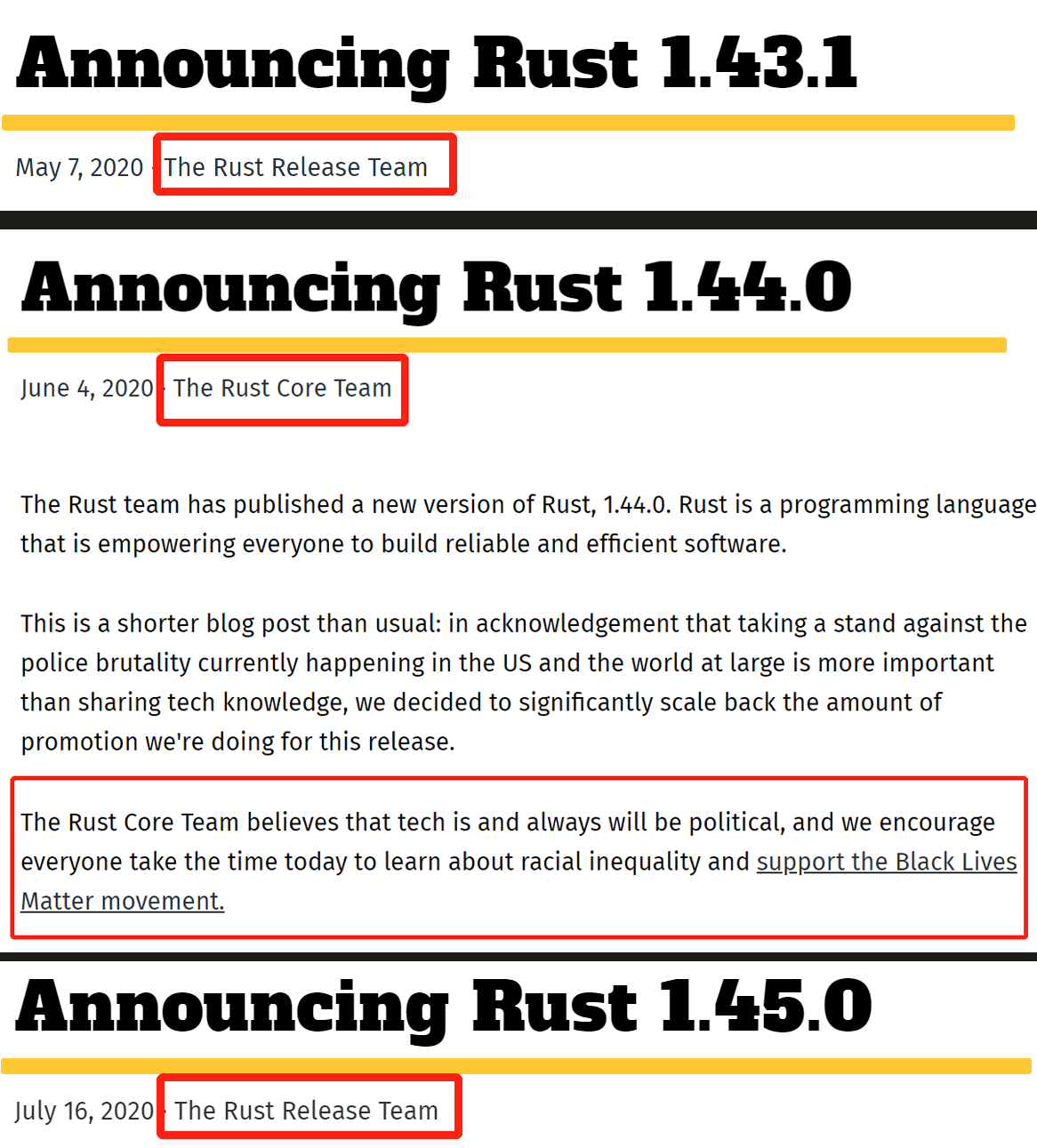 Rust 的版本发布博客一般由 Rust 发行团队来撰写/发布,此前的 1.43.1 版本和此后的 1.45 版本均是如此。然而, 1.44 版本的发布者变成了 Rust 核心团队,发布公告也变成了 Rust 核心团队表达自己政治立场的窗口: