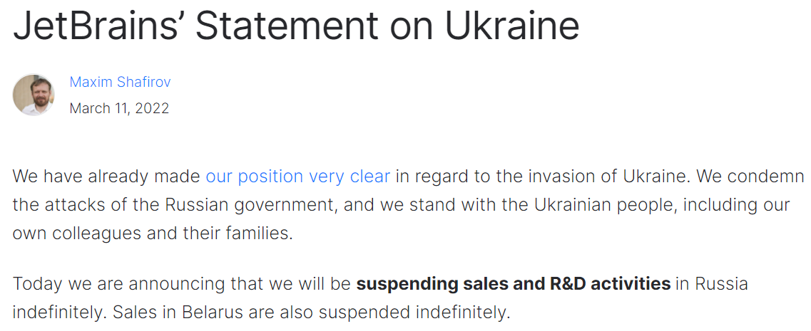 Shafirov 在公告提到,JetBrains 谴责俄罗斯政府发起的袭击,选择与乌克兰人民站在一起,包括他们的同事和家人。