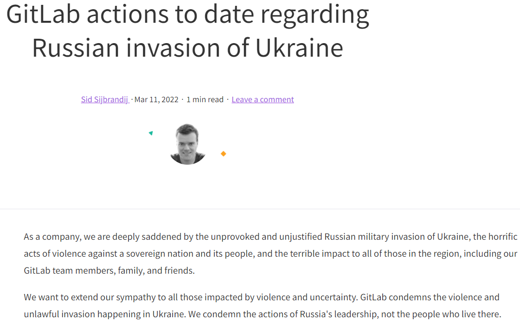 Sijbrandij 表示,GitLab 公司对俄罗斯政府无端且不正当地军事入侵乌克兰、针对一个主权国家及其人民的可怕暴力行为,以及对该地区所有人(包括 GitLab 的团队成员及亲朋好友)的可怕影响深感悲痛。GitLab 向所有受到暴力和不确定性影响的人表示同情。GitLab 谴责发生在乌克兰的暴力和非法入侵行为,谴责俄罗斯领导人的行动。