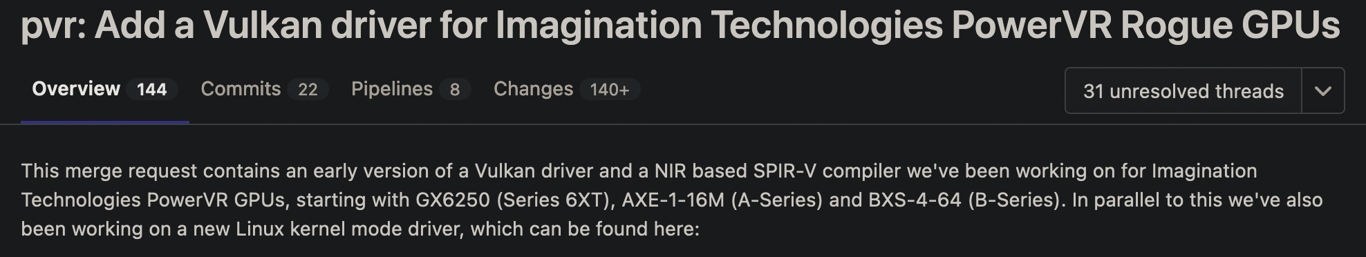 PowerVR 的 Mesa Vulkan 驱动基于开源的 RADV Radeon Vulkan 驱动,可以与他们新的 PowerVR 内核驱动,以及随开发套件提供的 PVRSRVMKM 内核驱动一起使用。