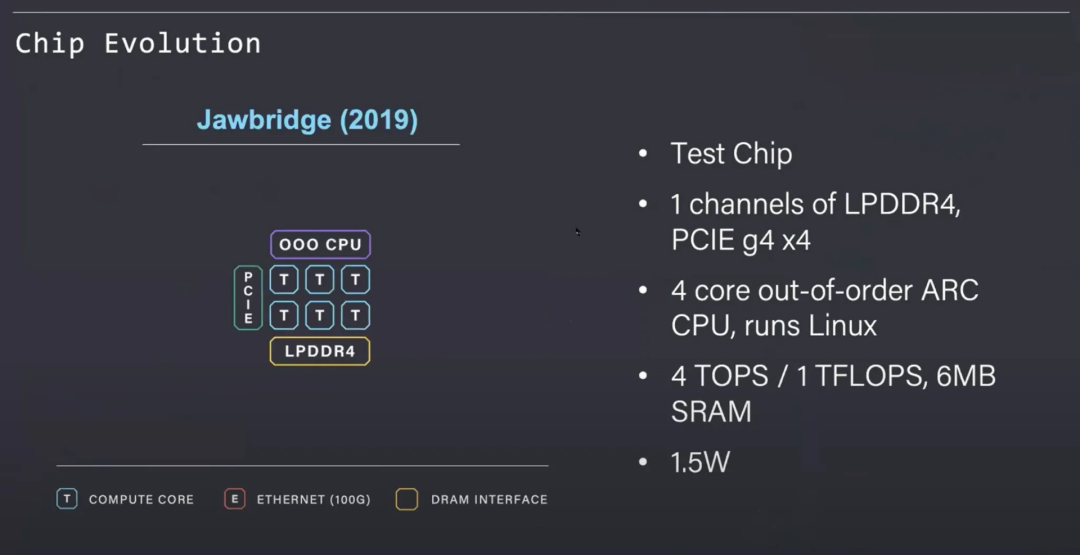 Jawbridge芯片非常小,功耗要求非常低。在当时有限预算的情况下,Tenstorrent制作了这款芯片,验证了他们声称的能耗和性能。基于这一概念验证的支持,Tenstorrent能够筹集更多资金来扩展到下一代产品。