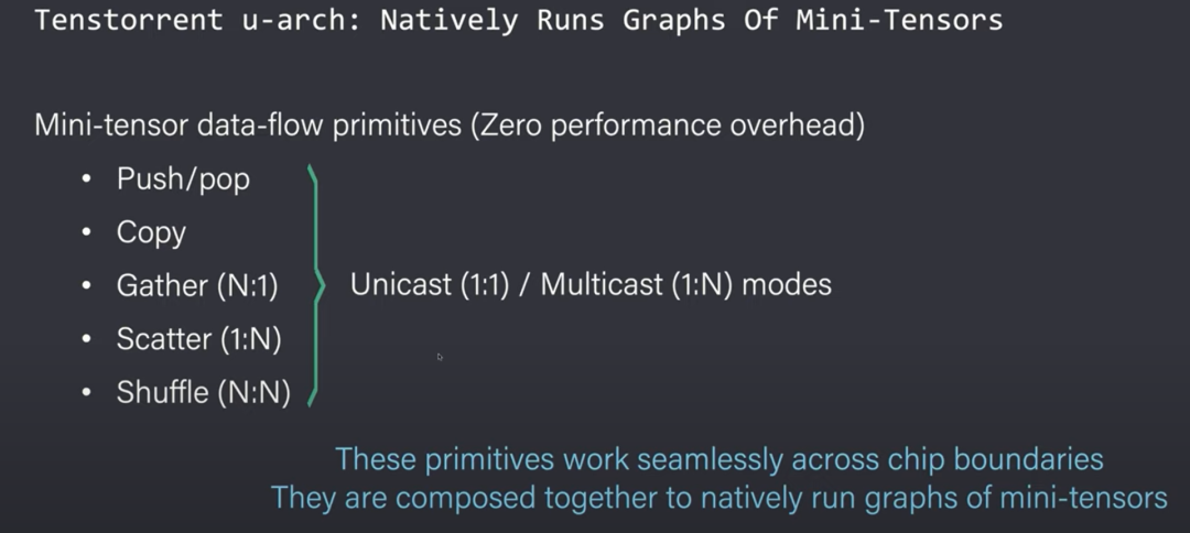 迷你张量数据包有5个关键基元,用于在核心之间进行移动数据包的推进/弹出(push/pop)。复制、收集、分散和随机洗牌也可用于单播(Unicast)或多播(Multicast),取决于图中的消费者或生产者关系。