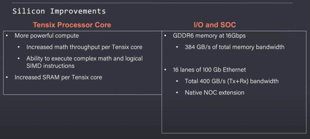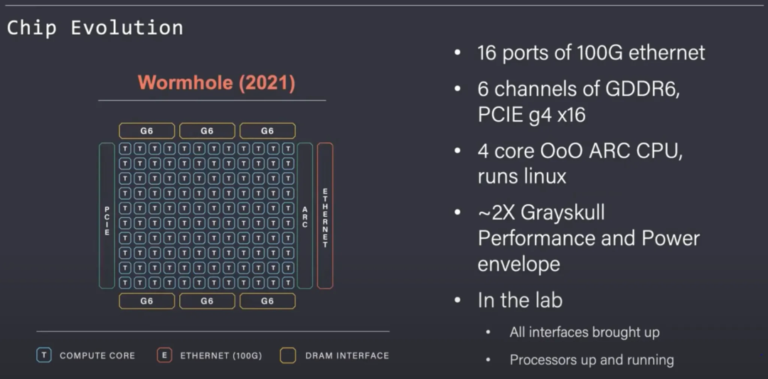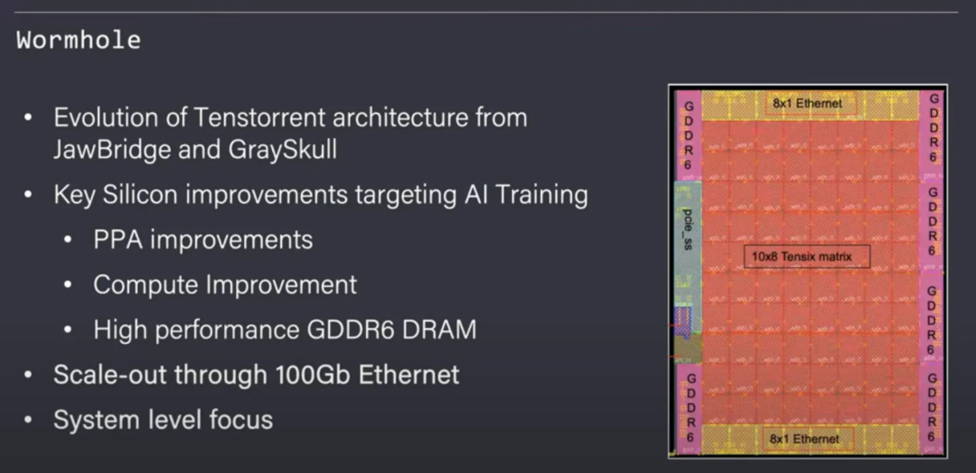 接下来就是虫洞,它是一个670mm^2的晶粒,也是基于格芯的12nm工艺。尽管同一节点的硅面积和利用率略有增加,但Tenstorrent能够显著地扩展性能、IO和可扩展性。除了性能更高、耗电量更大之外,与以前设计的最大不同之处在于,虫洞增加了16个带有100Gb以太网的端口。以太网端口使得许多芯片连接在一起,以扩展到大型AI网络。