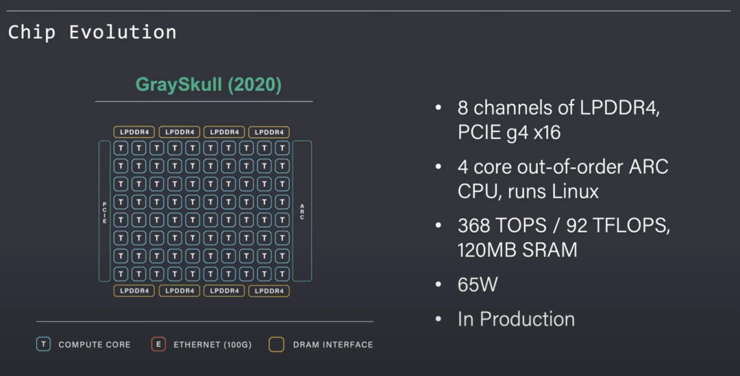 GraySkull是下一代演进的商业产品。该芯片有128个Tensix核,非常重要的NOC可大幅扩展,IO也更大。该芯片基于格芯(GlobalFoundries)的12nm工艺,尺寸为620mm^2。Tenstorrent还准备将A0硅推向市场,这也是他们设计能力的一个强有力证明。这意味着,他们设计芯片的路子是正确的,并且在第一次流片中没有发现错误。即使对于AMD、苹果、英特尔、英伟达等经验丰富的团队来说,这一成就也是非常罕见、值得庆祝的事。