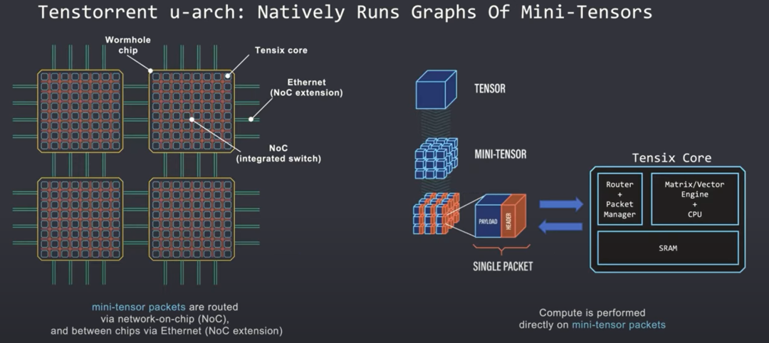 Tensix 内核直接在这些迷你张量数据包上完成计算,每个内核都包括一个路由器、数据包管理器以及大量的 SRAM。路由器和数据包管理器同步处理,并将计算包发送到通过以太网在片上或片外的网格互联线上。