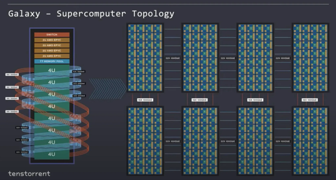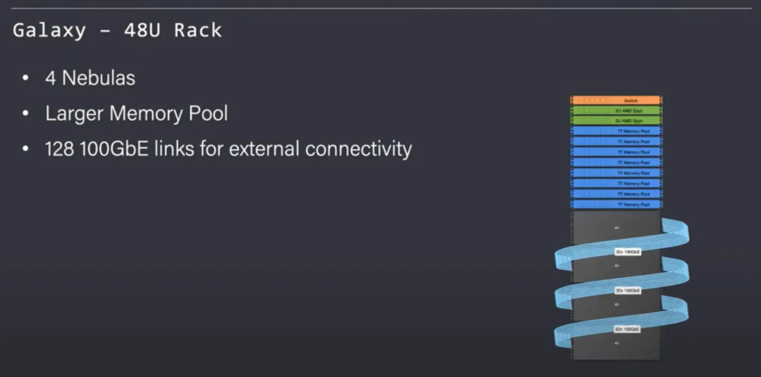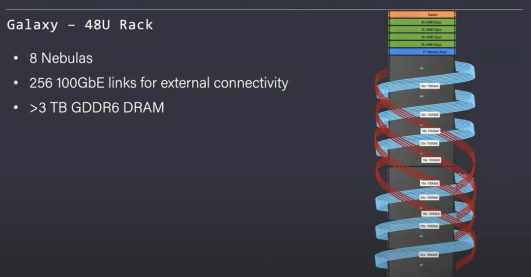 乐趣不止于此。Tenstorrent还展示了Galaxy,这是在一个扩展的网格中连接的8个Nebulas。该机架还包含4台AMD Epyc服务器和一个共享内存池。机架提供大于3TBs的GDDR6和256Gb的外部以太网链路。通用的AMD Epyc服务器和内存池连接到以太网。