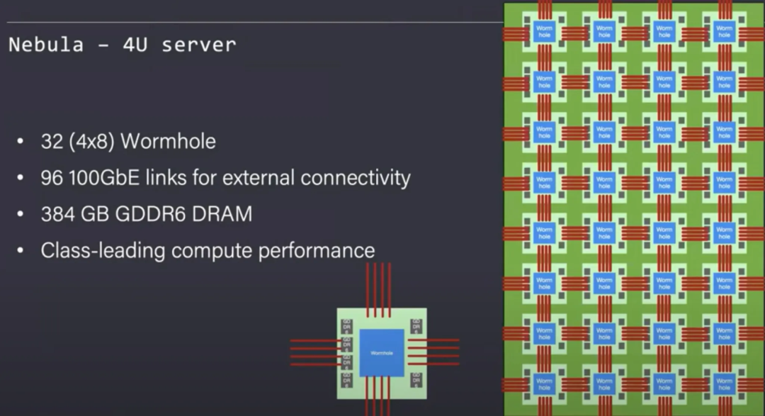 Tenstorrent设计了Nebula作为基础构件,它是一个4U服务器机箱,可以装入32个虫洞芯片,这些芯片内部连接成一个完整的网格,能够以透明的方式轻松地将这个网格扩展到远远超出单个服务器的范围。