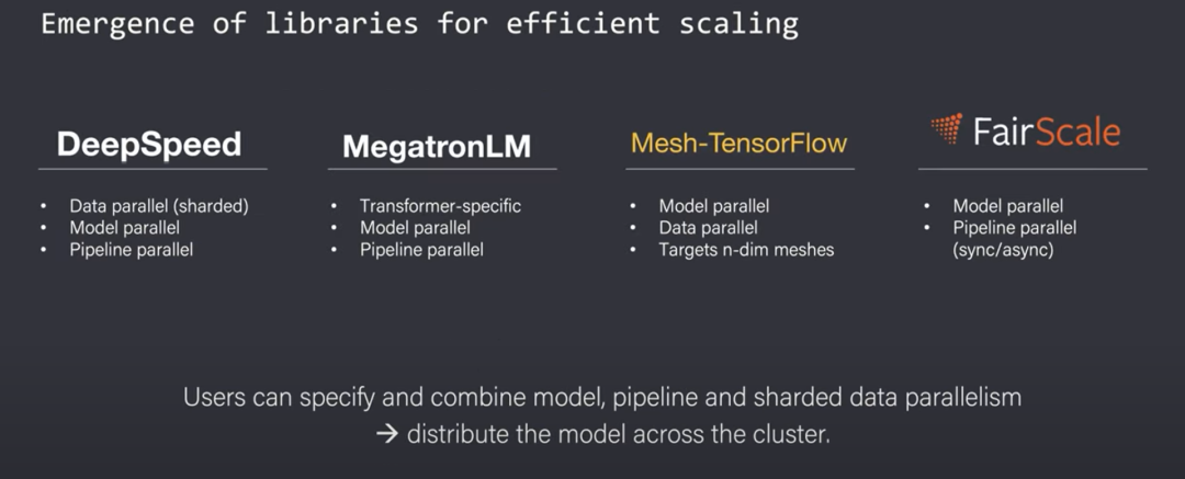 随着更大的模型开始发挥作用,用于有效扩展的库开始出现。用户现在可以跨服务器集群地指定和组合模型、流水,以及基于参数划分的数据并行。