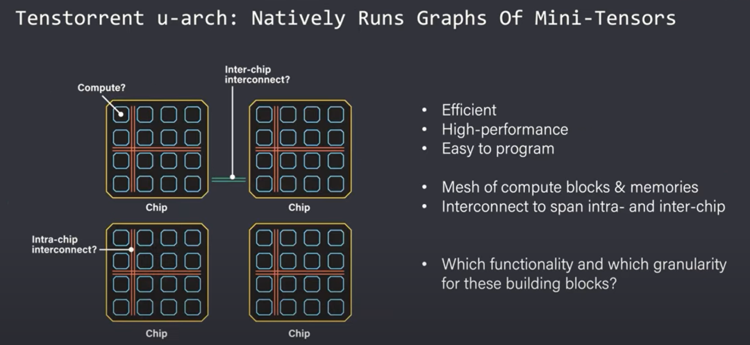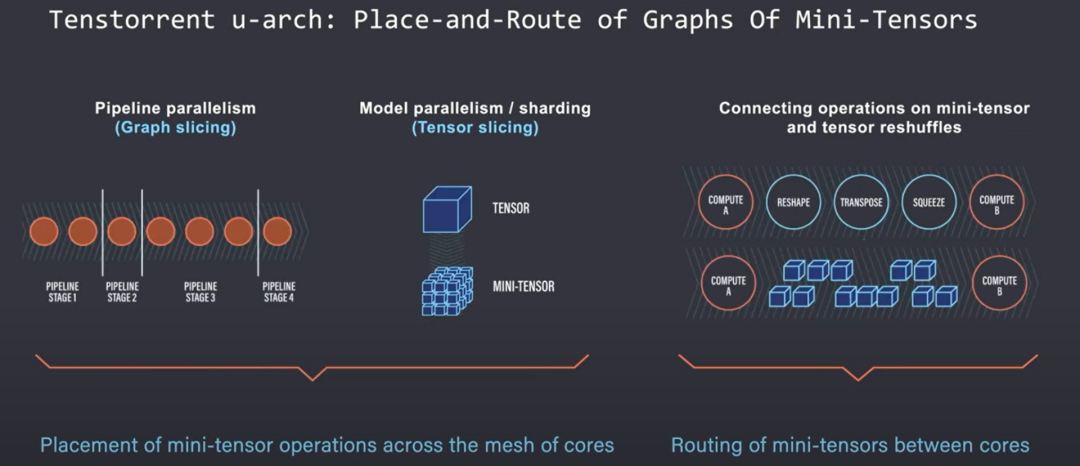 Tenstorrent 的目标是创建一个可以摆放(place)、路由和执行迷你张量操作图的架构。迷你张量被理解为 Tenstorrent 架构原生支持的数据类型。