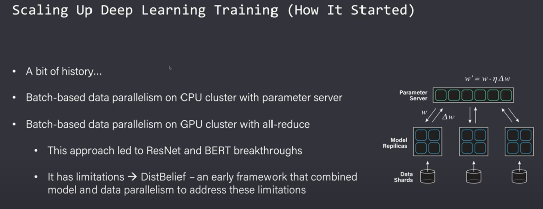 接下来,带有Allreduce和更高性能带宽的GPU集群提高了扩展性。这仍然有局限性,除了增加batch size和在集群中划分(Sharding)数据之外,还有一些早期尝试将其他类型的并行性结合起来。