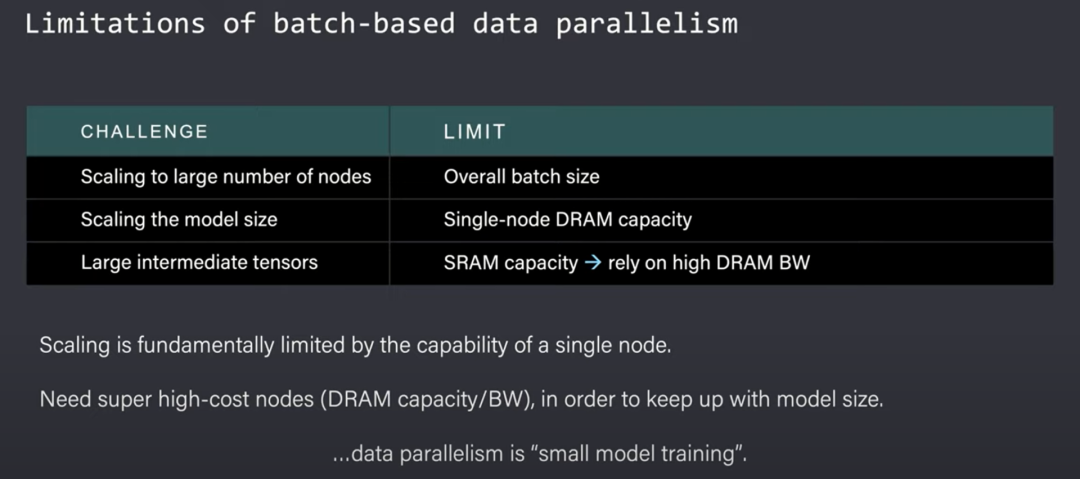最大的局限性是batch size不能过大。如果你继续增加batch size,模型无法将收敛并实现高精度。对于较大模型,DRAM容量成为一个约束,因为整个模型要在所有节点上进行复制。中间计算甚至不再适合在片上SRAM中进行,这需要大量的DRAM带宽来存储这些中间体。DRAM的大小和带宽增加的影响是每个节点的成本大幅上升。这种扩展方法对于小型模型很有效,但对于大型模型,很快就不再具有成本效益。