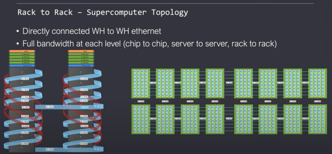 横向扩展能力还并不止于此。Tenstorrent支持机架组件连接在一个二维网格,关键是用软件来处理横向扩展的问题。对于软件来说,这个网络看起来像是一个由Tensix核组成的大型同质网络。片上网络可以透明地扩展到许多机架的服务器,而不需要再对软件进行重写。