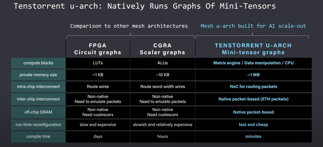 与其他网格架构相比,Tenstorrent 网格更大且更具可扩展性。 FPGA网格处于非常精细化的水平,需要大量时间来手动调整。CGRA网格能运行标量图,但它们仍然有许多限制因素。Tenstorrent 在其矩阵引擎中有多个浮点运算和更大的内存。