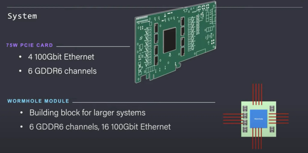 除了通过以太网进行扩展,每个Tensix核都得到了大幅升级。每核都拥有更多SRAM,可以执行更复杂的数学和SIMD指令。虫洞有一个192位GDDR6内存总线,能够提供384GB/s的内存带宽。尽管矩阵运算的性能提高了两倍,内存带宽提高了近3倍,并且虫洞有1.6TB的网络交换容量,但虫洞芯片的功率仅增加了一倍,即150W。