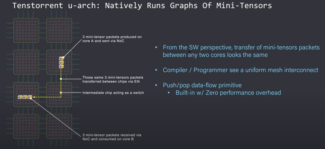 这意味着研究人员不必为张量切片而烦恼。每个微张量被当作一个单独的数据包处理,这些数据包有一个数据有效负载和一个包头(header),用于在核心网格内识别和路由数据包。