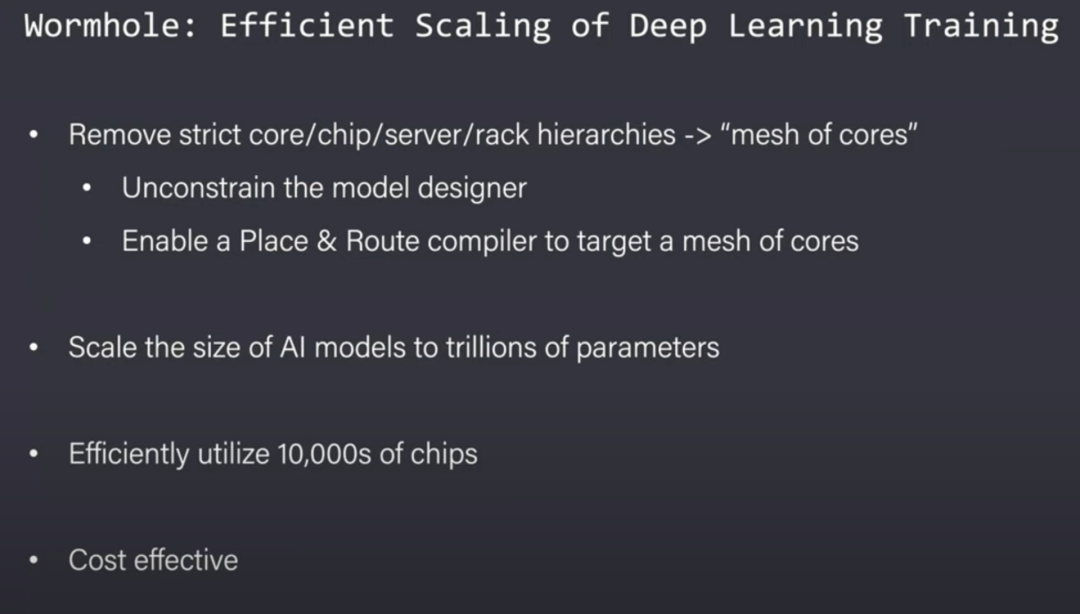 如果他们的主张得到证实,Tenstorrent 已经取得了真正神奇的成就。他们强大的虫洞芯片可以通过集成以太网端口扩展到许多芯片、服务器和机架,而无需 任何软件开销。编译器会看到一个无限的内核网格,没有任何严格的层次结构。这使得模型开发人员在大规模机器学习模型的扩展训练中不用担心图切片或张量切片。