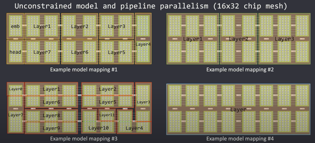 第4个示例表明,如果网格足够大,甚至可以跨服务器机架延伸单个层。编译器会看到网格的大小,并根据它们的大小映射到层,无论内核网格有1个芯片还是跨多服务器机架的10000个芯片。