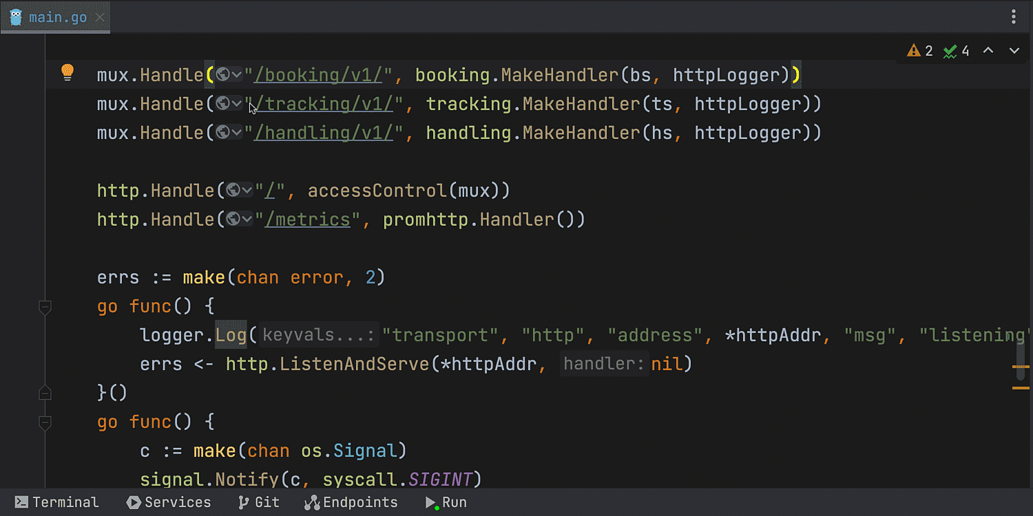 此外,可以在 Endpoints 工具窗口中查看 Go 文件的端点,可以从 Endpoints 工具窗口使用 Jump to Source,也可以单击每个单独的端点并直接从 HTTP 客户端选项卡运行请求。