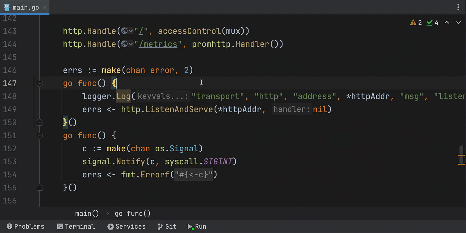 - IntelliJ IDEA Ultimate 现在为 Go 文件中的 HTTP 方法和标头提供补全,每个端点旁边都会出现一个地球图标,如果单击它,IntelliJ IDEA Ultimate 将建议几个选项。