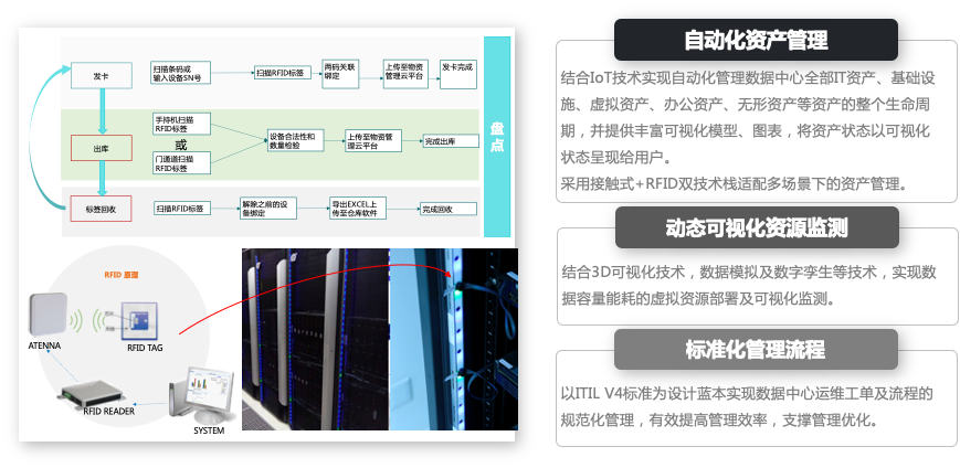 针对新形态数据中心资产管理的创新型需求,通过“软件+硬件+流程引擎”为一体的资产管理解决方案,实现资产管理的智能化、自动化全生命周期管控,帮助客户有效降低资产总体拥有成本: