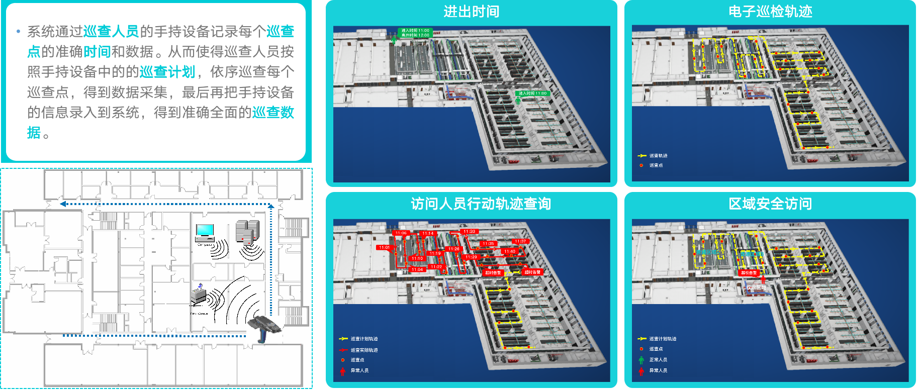 - 左上:对巡查人员的进出时间以及当前所处的位置进行监控;
