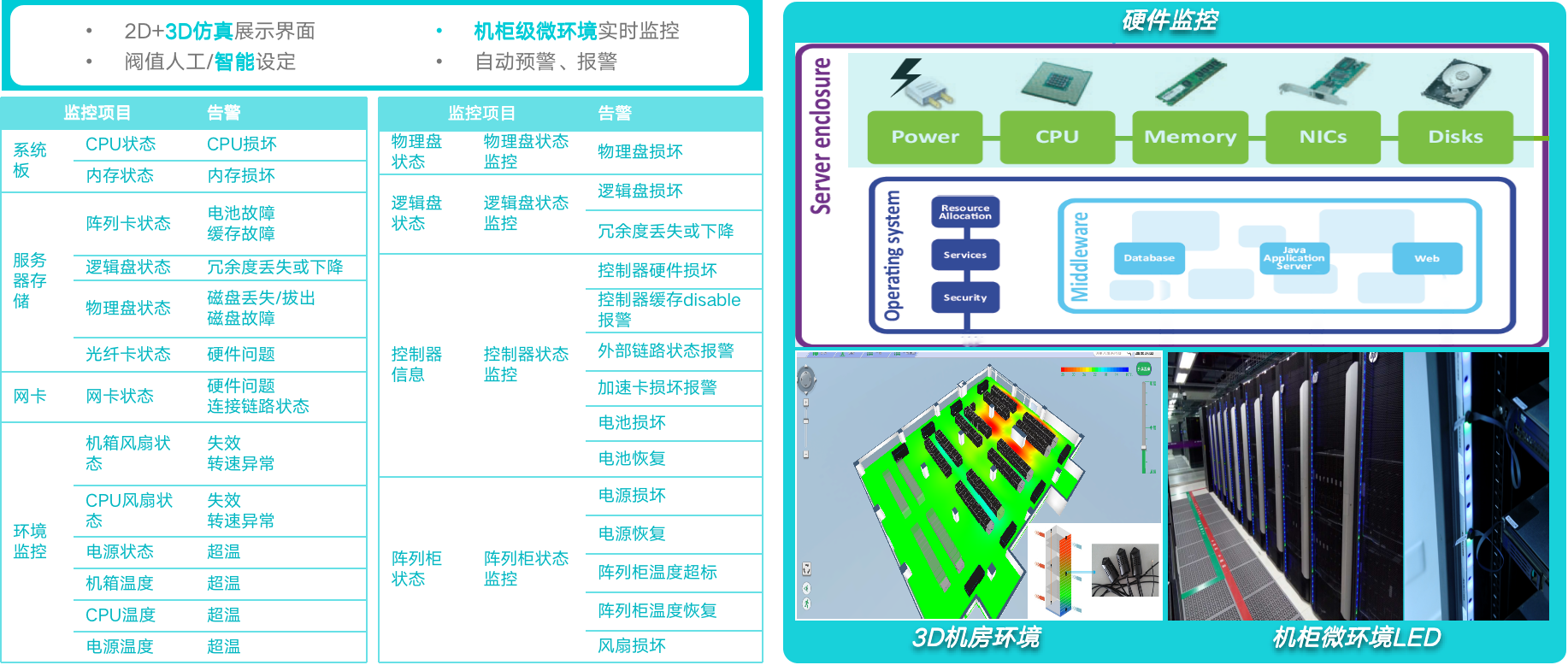 下图展示了云智慧可以监控的典型资源与对应的告警类别。特别是对于机柜级微环境的温湿度的实时监控能力,弥补了当前绝大部分数据中心管理的空白。例如:云智慧可以监控每个机柜的局部制冷量,避免过度制冷或者局部过热导致的IT设备运行故障。