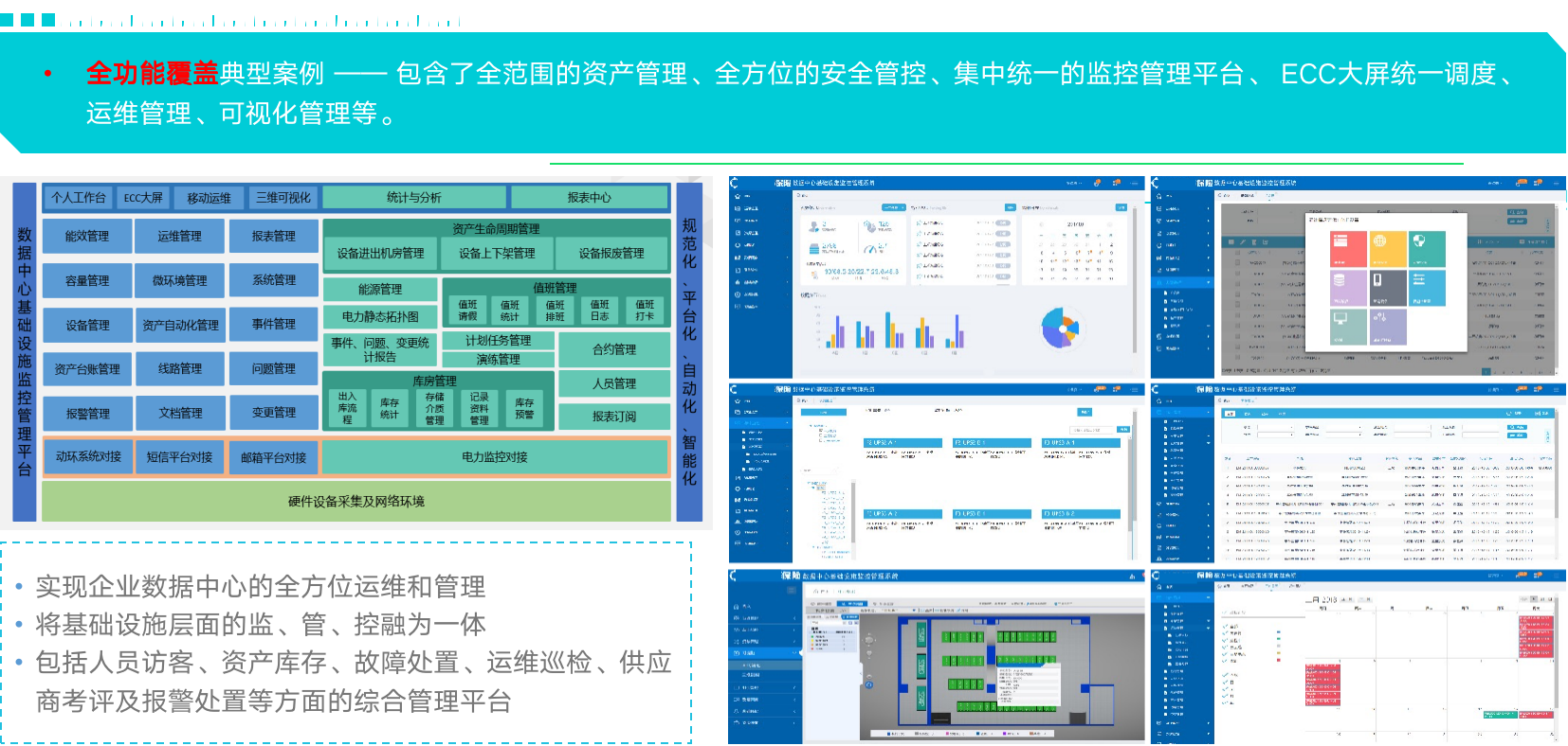 统一运维平台是在上述资产全生命周期管理的基础上提供了基础环境的全覆盖监控,包括机房环境、机柜微环境以及基础资源。