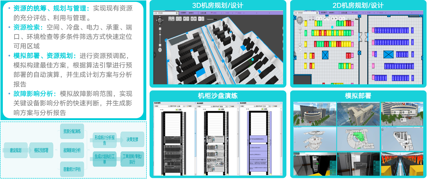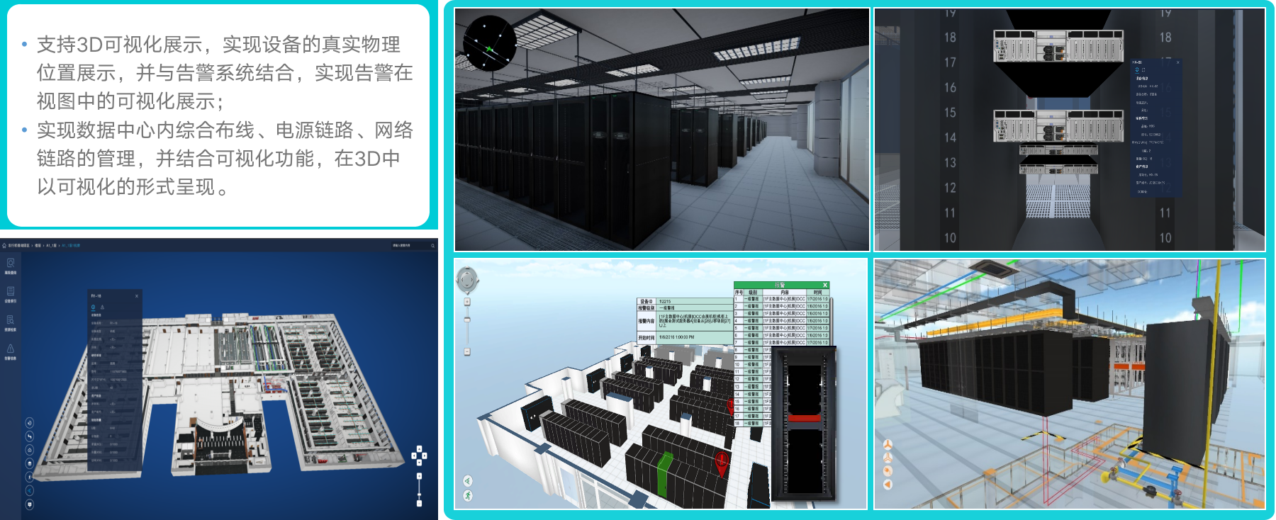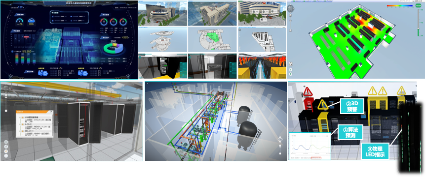第三个优势点在于其丰富的展示能力: 既支持传统2D环境下的各种图形图表,也支持3D环境下的BIM、虚拟现实,同时,云智慧还可以与LED硬件进行交互,实现与现实世界联动;平台为客户提供了基于AI算法的容量预测、沙盘演练手段,提升数据中心客户应急调度、预测性维护能力。