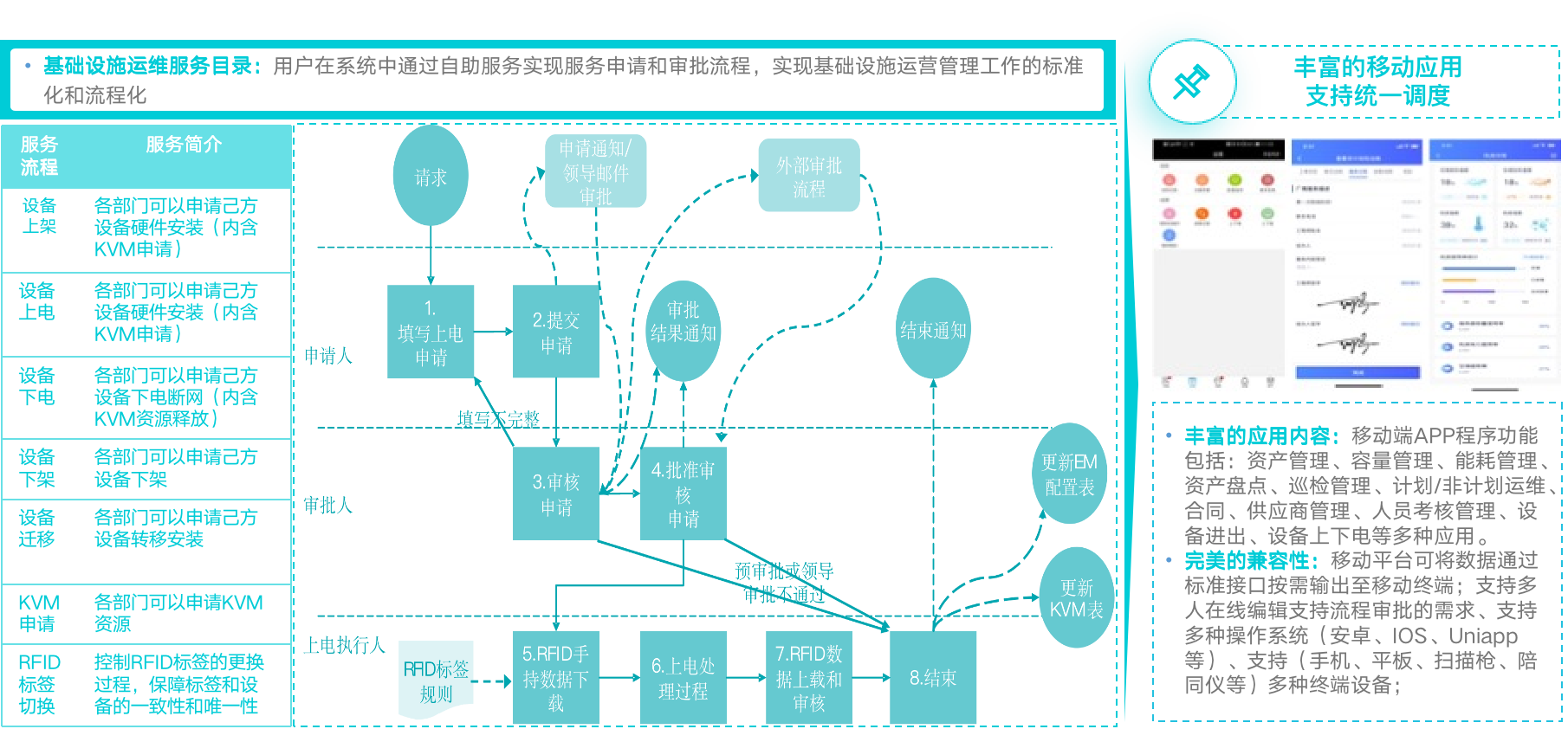 云智慧为企业提供了内容完整、流程标准的运维服务功能,以实现数据中心日常运维的流程化、标准化、精细化。此外,云智慧通过帮助企业建立快速响应并适应企业业务环境及发展的基础设施运维模式,实现类比 ITIL 的流程框架、运维自动化管理,从而转变企业基础设施运维的环境,使得基础设施运维各部门和IT运维部门领导者能够拥有统一的语言、统一的界面来面对各项挑战以及理解新变化所带来的影响。 与此同时,云智慧会为企业提供丰富的移动端应用,实现多渠道协同办公。云智慧的移动应用可以兼容市面上绝大多数的移动平台——无论是操作系统还是终端设备类型,给企业带来更便捷的使用体验。