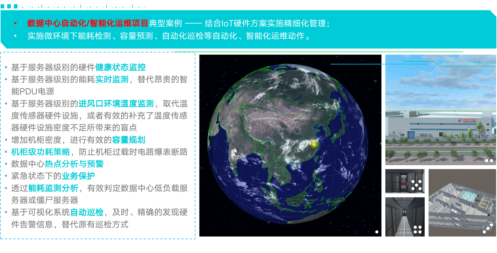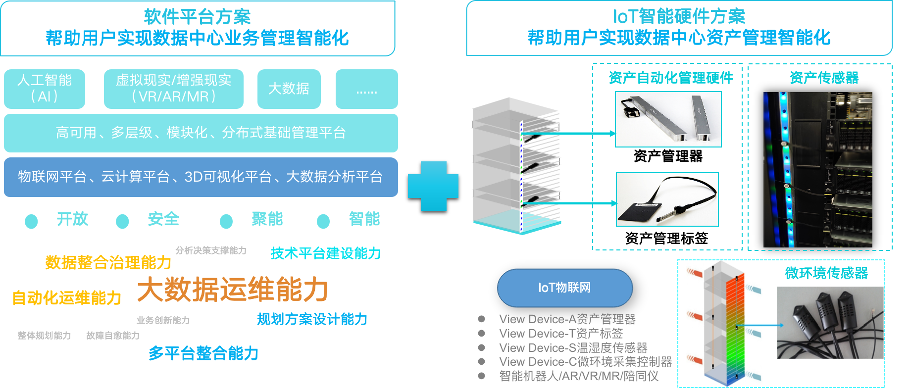 整个解决方案包括软件和IoT智能硬件两部分。其中软件平台部分帮助用户实现数据中心业务管理智能化,为企业赋能多样化能力:如多平台整合、大数据运维、自动化运维、规划设计、决策支撑等; 而IoT智能硬件部分则是帮助用户重点实现数据中心资产管理智能化,以及通过丰富的感知器从数据源头控制资产生命周期的时效性与准确性。